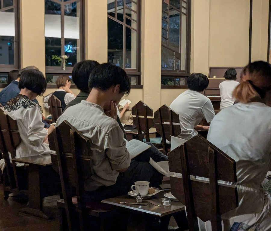 各会場でコーヒーやスイーツなどの喫茶メニューを提供します。(写真は自由学園明日館のもの)4/19は図書館に併設されているカフェにて、コーヒーや紅茶などをご注文可能です。ふた付きの飲み物であれば、館内どこでもご利用いただけます。カフェで購入した食べ物はカフェ席またはラーニングコモンズをご利用ください。