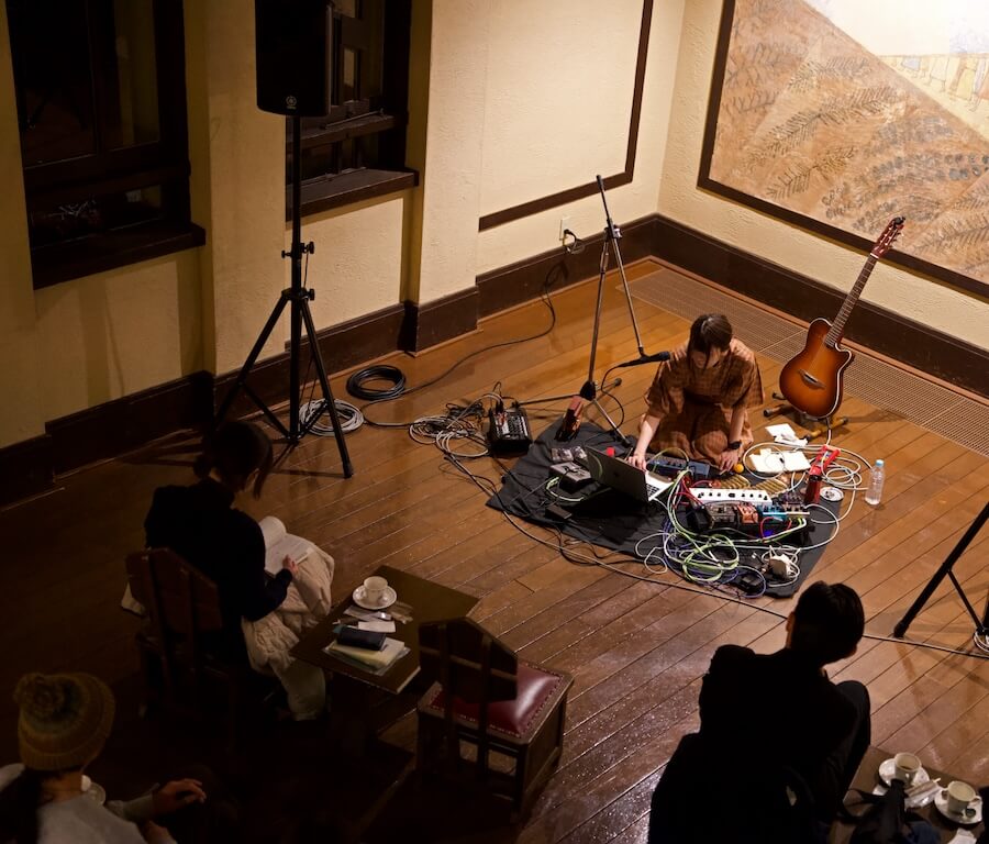 清澄白河で開催されたアートプロジェクト『本と川と街』プログラムの一つとして、古民家で2組の出演者による読書BGMライブを2回開催。出演者が「本のページをめくる音」をその場で録音してループ演奏したり、窓の向こうから聞こえる子供の声や工事の音という「街の音」とセッションするライブとなり、参加者は「家」が持つ落ち着きの中でもくもくと本を読む時間になった。
